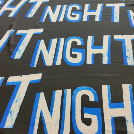 Morbido e fresco raso in pura seta, in altezza 150cm, con base nera e scritte "night" di grandi dimensioni in bianco e blu. Tessuto satin molto pregiato e ideale per la realizzazione di abiti da cerimonia o casual, nella fattispecie giacche, pantaloni gonne e camicette.