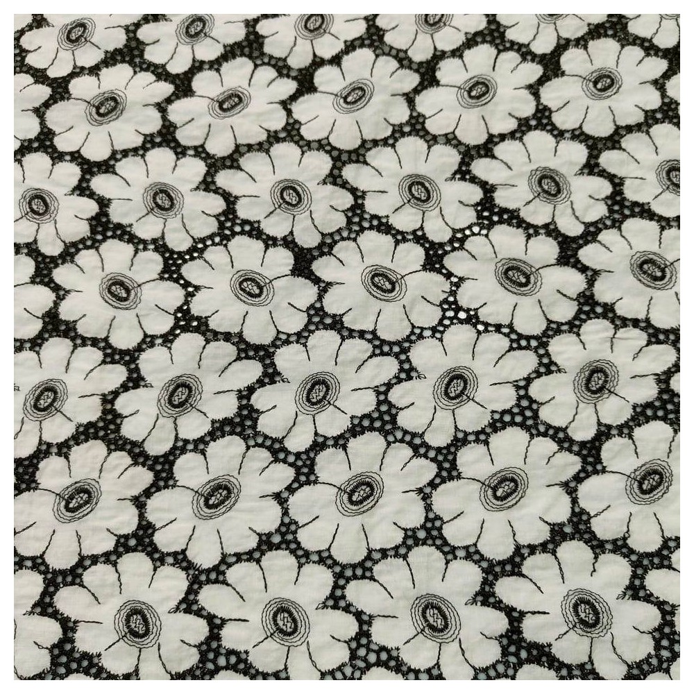 Tela in puro cotone, leggero e morbido,base bianca e ricamo sfondato in nero che forma delle margherite. Ideale per realizzare camicette, gonne filzate e vestitini leggeri, ma anche per hobbistica.