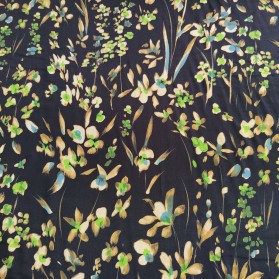 Un morbido raso di viscosa, con una base blu scuro e fantasia floreale sui toni del beige, verde e celeste. Tessuto satin ideale per vestiti estivi da donna o camicie. La viscosa è tra i tessuti più freschi e comodi per l'Estate.