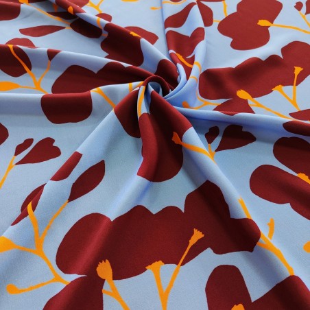 Un morbido tessuto in viscosa, con una base celeste polvere e fantasia floreale stilizzata arancio e bordeaux. Tessuto ideale per vestiti estivi da donna o camicie. La viscosa è tra i tessuti più freschi e comodi per l'Estate.