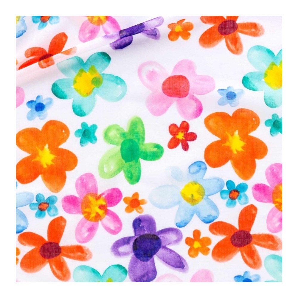 Un tendaggio in 100% poliestere effetto lino, h 300cm, con base bianca e stampa con fiori multicolor. Il tessuto è molto pratico, a differenza del puro Lino, pur mantenendo un aspetto molto simile ad esso. Tessuto ideale per le camerette dei bambini.