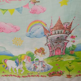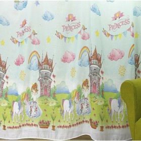 Un tendaggio 100% poliestere, effetto lino, con stampa balzata a tema fiabesco con principesse, unicorni e castelli incantati. Il tessuto è molto pratico, a differenza del puro lino, mantenendone un aspetto molto simile.