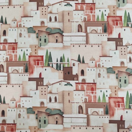 Tessuto Resinato con fantasia casette colorate di un borgo antico, per uno stile ricercato.